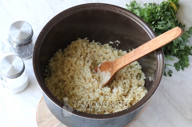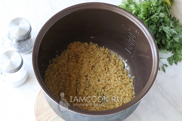 Помешивая, обжарить крупу до появления приятного орехового запаха, 1-2 минуты.