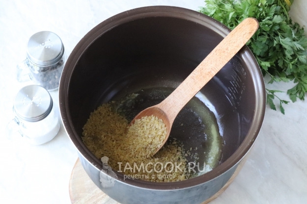 В чашу мультиварки выложить кусочек сливочного масла и включить режим "Жарка". Дождаться, когда масло растает, и всыпать булгур. Промывать данную крупу не обязательно, она и без этого проходит специальную обработку.