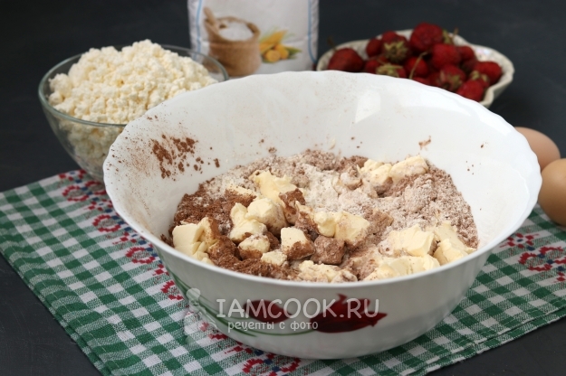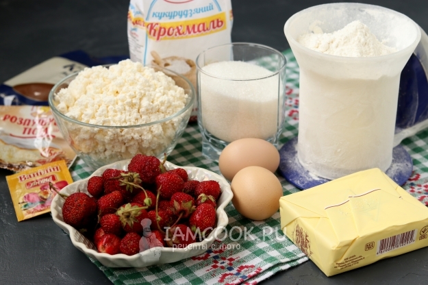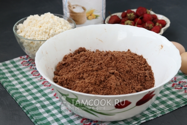 Для приготовления пирога с шоколадной крошкой, творогом и клубникой подготовить из списка необходимые ингредиенты.