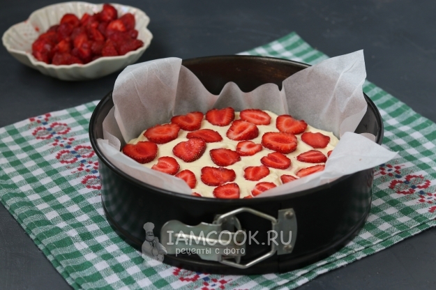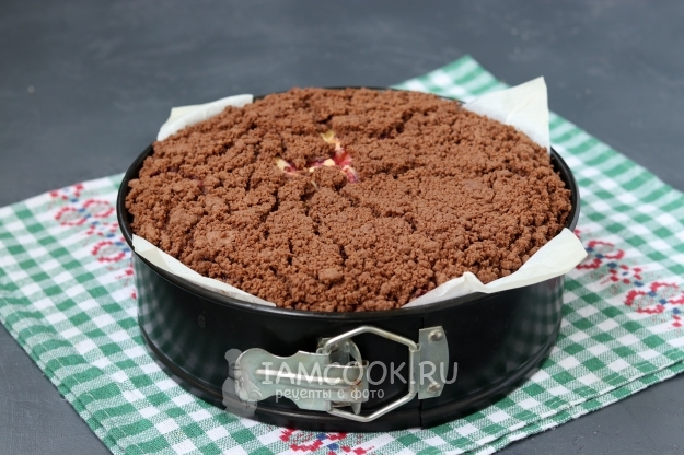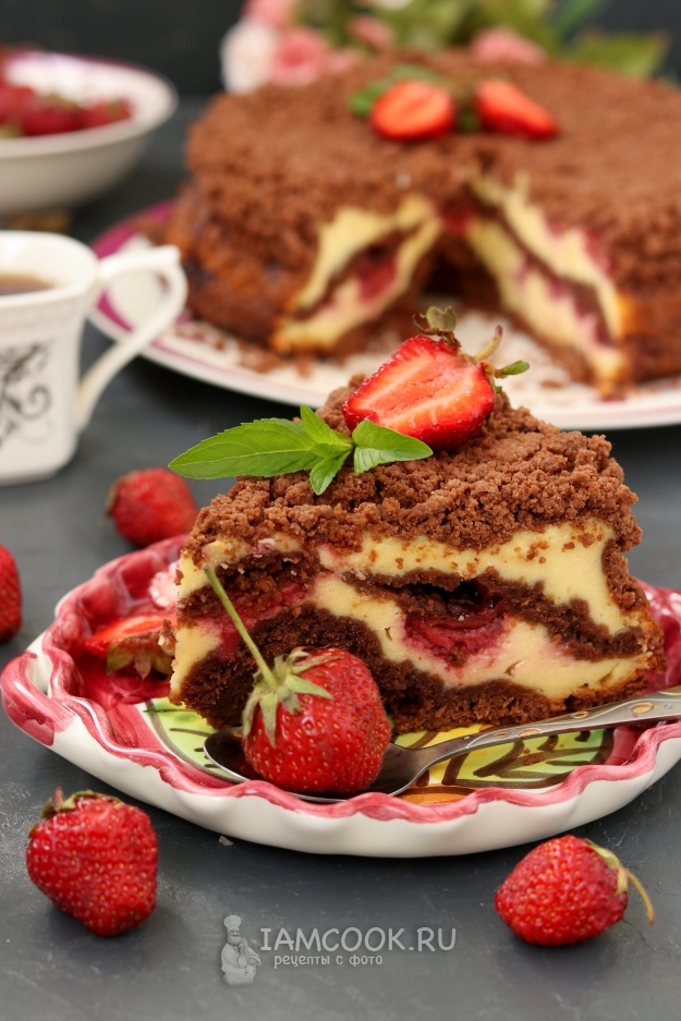 Духовку разогреть до 180 градусов и выпекать пирог с шоколадной крошкой, творогом и клубникой 30-35 минут. Готовому пирогу нужно дать полностью остыть.