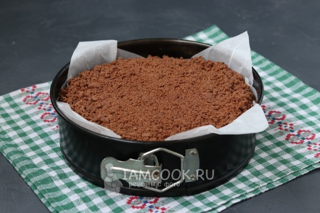 Песочную крошку зрительно разделить на 3 равных части: если чуть больше или меньше - не страшно. Дно формы застелить пергаментом, выложить треть шоколадной крошки. Немного примять крошку руками. Сверху выложить половину творожной массы. Промыть клубнику, оторвать хвостики и разрезать каждую ягоду пополам. Половину клубники срезом вверх выложить на творожную массу.