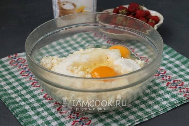 В другой миске приготовить начинку: поместить в неё творог, добавить сахар, ванилин, яйца и крахмал.