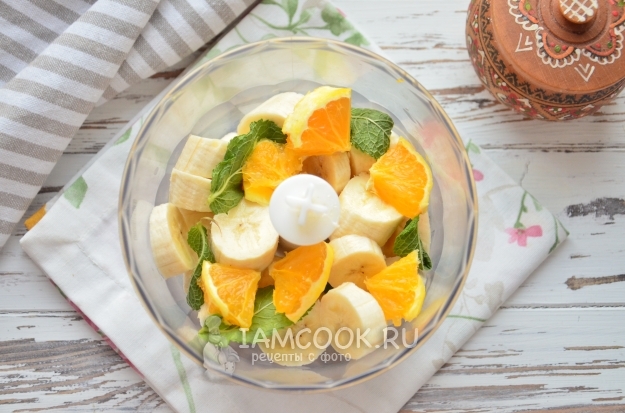 Апельсин очистите от кожуры, разберите на дольки, а уж дольки нарежьте небольшими кусочками. Сложите их в чашу блендера. Листья мяты нужно помыть и отправить к остальным продуктам.