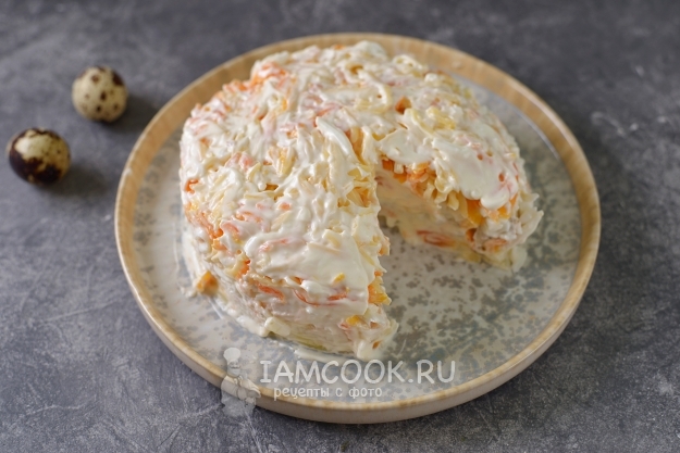 Теперь нужно пройтись лезвием ножа по кругу салата, накрыть миску блюдом и перевернуть пиалу с салатом. Дальше нужно вырезать один сегмент в виде треугольника, его можно смело съесть))). Смажьте слегка все стороны заготовки майонезом.