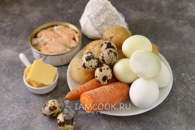 Подготовьте продукты по списку. Картофель и морковь помойте щеткой под проточной водой. Положите в казан вместе с яйцами. Варите перепелиные яйца не дольше 3-4 минут, куриные - 10 минут, а овощи - до полной готовности. При проколе их зубочисткой она должна легко входить. Почистите картофель и морковь от кожуры. Откройте банку рыбных консервов, слейте воду. Консервы берите любимые - сайру, ставриду, горбушу или лосося. У меня - лосось.