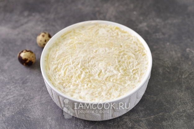 Последним слоем кладем натертый картофель, его также чуть смазываем майонезом. Отправляем салат в холодильник на час.