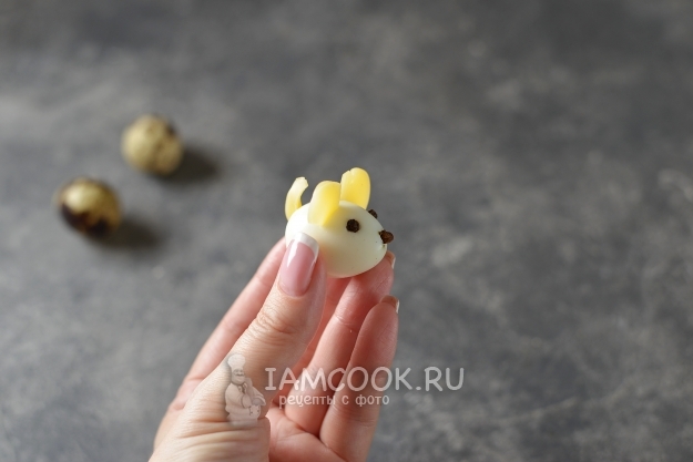 Из твердого сыра вырежьте ушки и хвостик, сделайте небольшие надрезы, вставьте их в перепелиное яйцо вместе с глазками из черного перца и носиком из гвоздики. То же самое сделайте с куриным яйцом - это будет мама-мышка.