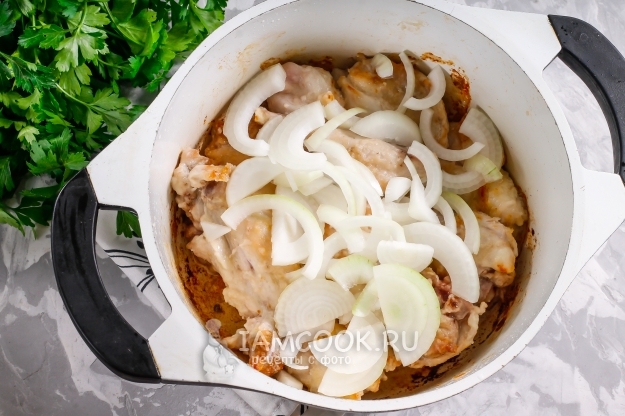 Очистите репчатый лук от шелухи, промойте и нарежьте полукольцами. Добавьте в казан, перемешайте и обжарьте еще минуту.
