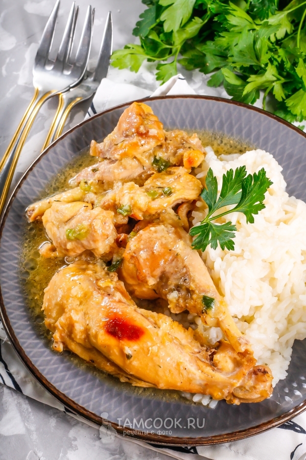 Готовое фрикасе из кролика в винном соусе подавайте горячим с отварным рисом или картофелем.