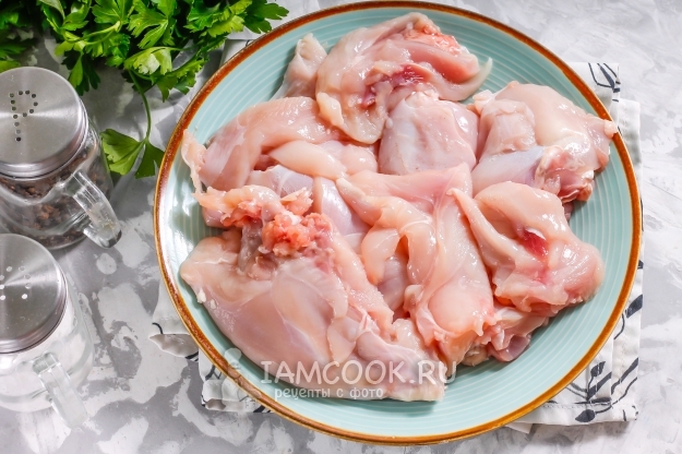 Тщательно промойте мясо и срежьте жилы, пленки. Нарежьте небольшими кусочками.