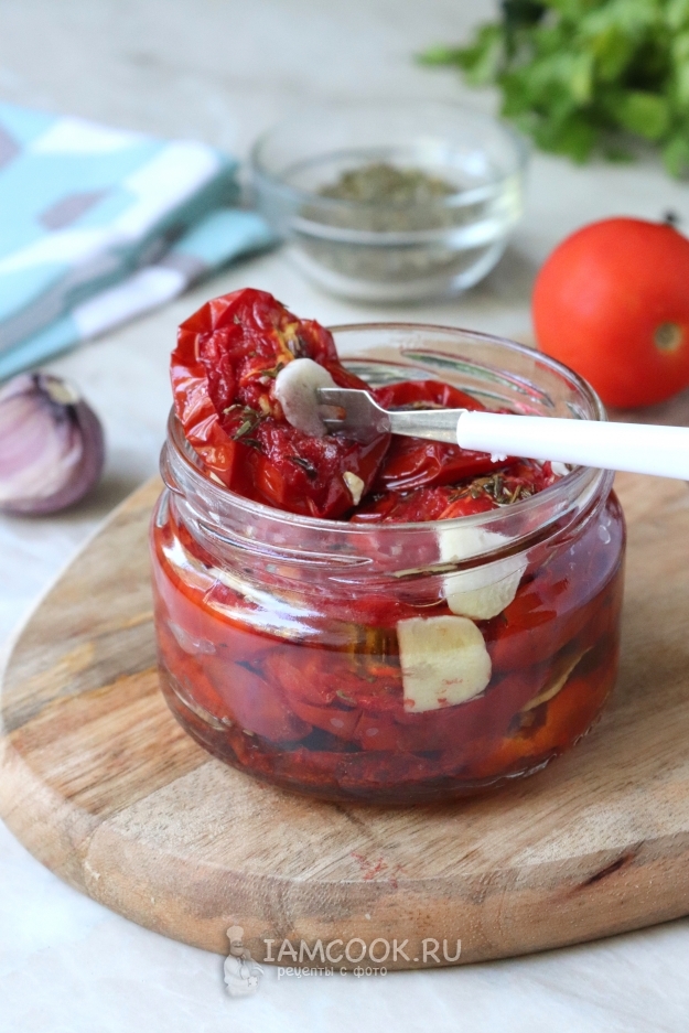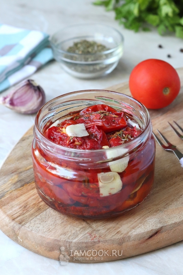 Вяленые помидоры, пока они ещё тёплые, аккуратно снять с тарелки и переложить в чистую сухую банку. Добавить чеснок, нарезанный тонкими пластинами, и залить содержимое тары растительным маслом.