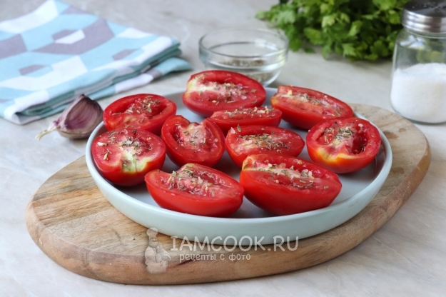 Подготовленные половинки помидоров посолить по вкусу и посыпать прованскими травами.