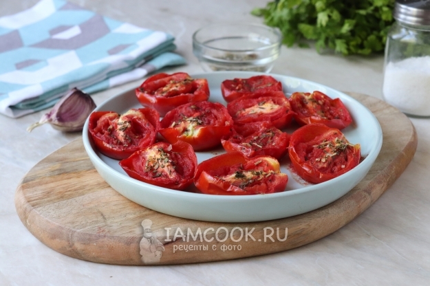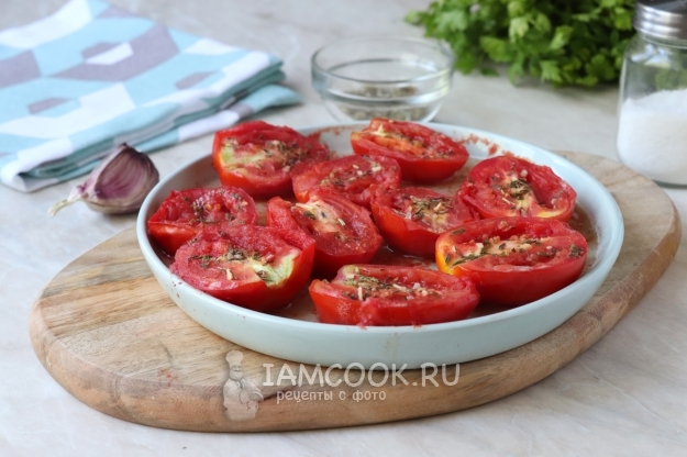 Для приготовления вяленых помидоров в микроволновке подготовьте продукты по списку к рецепту.