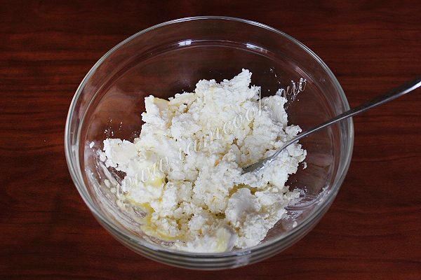 Яйца разделите на белки и желтки. Масло размягчите и разомните при помощи вилки, затем соедините его с желтками, добавьте сахар обычный и ванильный. Затем введите в эту смесь творог и как следует перемешайте.
