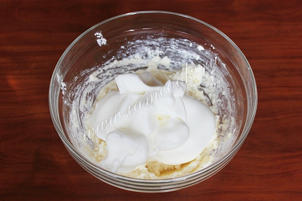 Белки взбейте до устойчивой пены, а затем аккуратно введите их в приготовленную ранее творожную массу. Перемешайте.