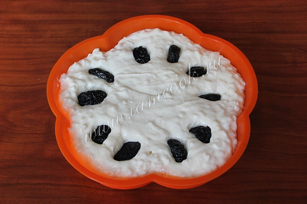 Перевалите творожно-рисовую массу в смазанную или силиконовую форму, повтыкайте чернослив или другую начинку.