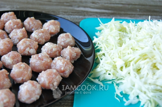 Пока картошка варится, нашинкуйте капусту тонкой соломкой, из фарша сформируйте фрикадельки нужного размера, я предпочитаю делать небольшие.