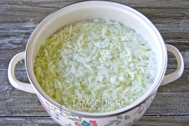 Как только вода с картофелем закипит, снимите пенку, опустите капусту.
