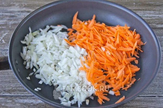 За это время обжарьте нарезанный репчатый лук и тертую морковь на сковороде с растительным маслом до румяности.