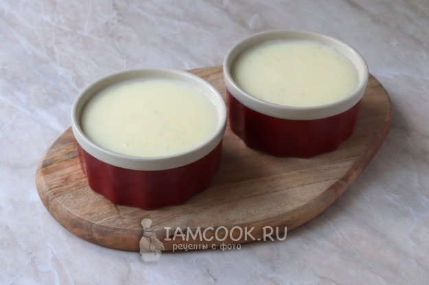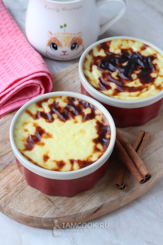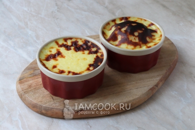 Ставим их на противень, в который наливаем воду, примерно 1/4 высоты формочек. Отправим нашу конструкции в разогретую до 200 градусов духовку на 20-25 минут. За 5 минут до готовности включим верхний нагрев, чтобы появилась запечённая корочка, которая является обязательным атрибутом данного блюда.