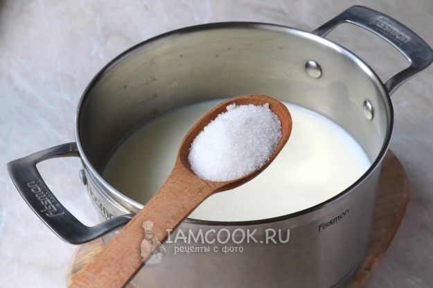 Молоко выливаем в подходящую кастрюлю (отлив 0,5 стакана для развода крахмала), всыпаем простой и ванильный сахар.