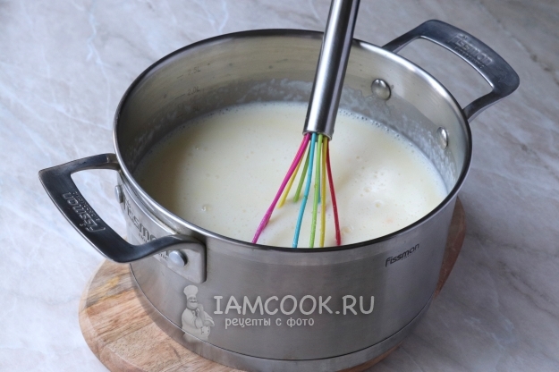 В кипящее молоко тонкой струйкой вводим смесь для загущения, энергично размешивая венчиком, чтобы не образовались комочки.