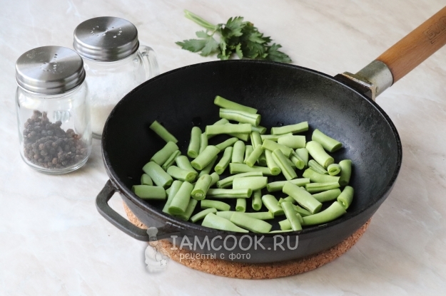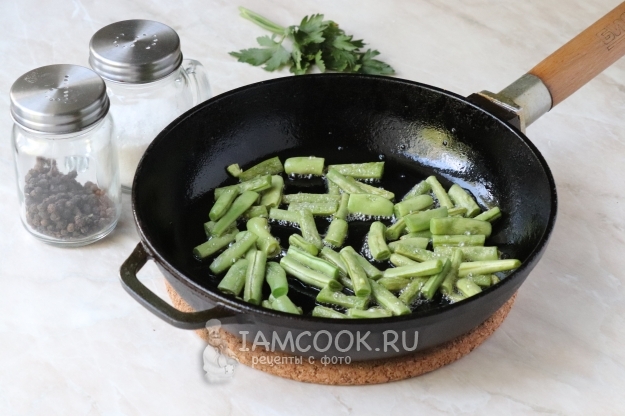 Стручковую фасоль помойте под холодной проточной водой, обсушите и срежьте жёсткие участки. Сами стручки разрежьте на несколько частей. Отправьте фасоль на сковороду, разогретую с растительным маслом.