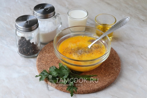 Добавьте соль и чёрный молотый перец по вкусу. С помощью вилки (венчика) взбейте массу до однородного состояния.