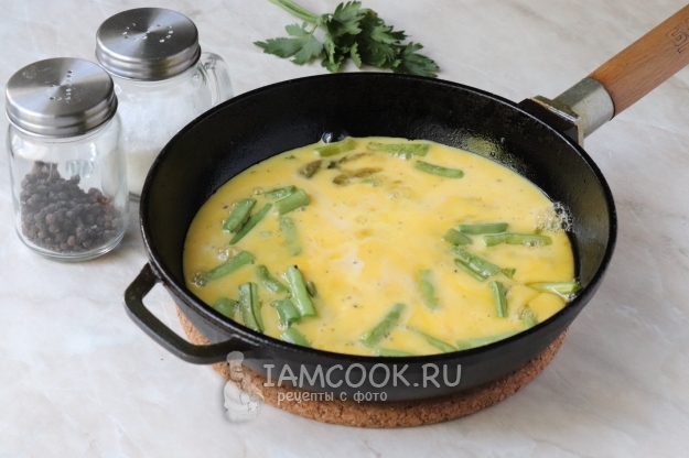 Обжаренную фасоль слегка подсолите и залейте яичной смесью.