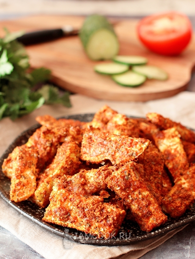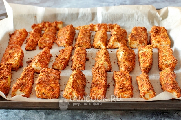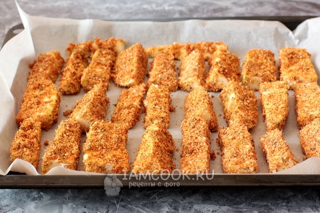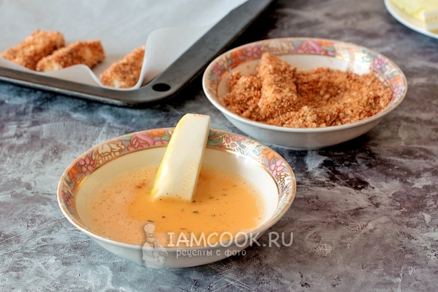 Обмакните кусочки кабачка в яйцо, а затем обваляйте в сыре со специями. Выложите подготовленные таким образом брусочки на противень.