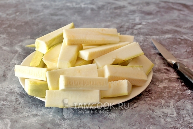 Кабачок нарежьте крупными брусочками. Если кабачки молоденькие, то чистить их не нужно, срежьте только кончики.