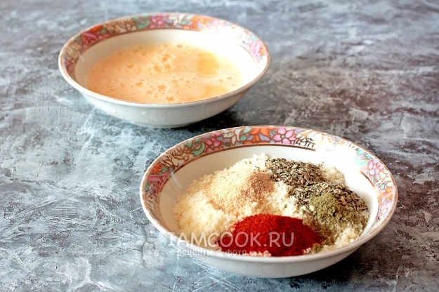 Яйцо хорошенько взболтайте вилкой. В мисочку насыпьте пармезан и добавьте все заявленные специи, тщательно перемешайте.