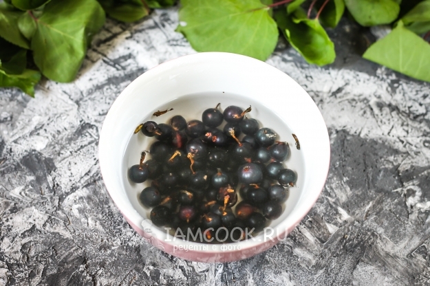Черную смородину переберите, высыпьте в миску и залейте холодной водой. Тщательно промойте, обрежьте хвостики с ягод.