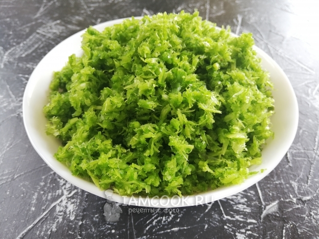 Перекручиваем чесночные стрелки на мясорубке с мелкой решёткой.