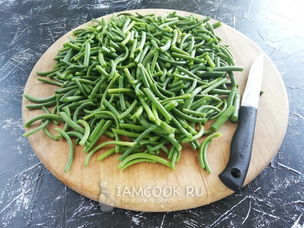 Итак, моем чесночные стрелки, отрезаем верхнюю часть стрелки (саму семенную коробочку) и нижнюю жёсткую часть (если таковая имеется). А затем нарезаем на небольшие кусочки.