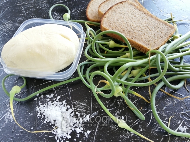 Для приготовления такой остренькой и очень ароматной намазки из стрелок чеснока и сливочного масла нам понадобится всего лишь 3 компонента и хлеб, чтобы её съесть))) Пропорции чесночных стрелок и масла можно изменять по своему вкусу. В рецепте указано количество, которое использовала я.