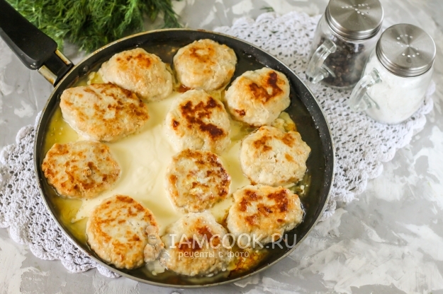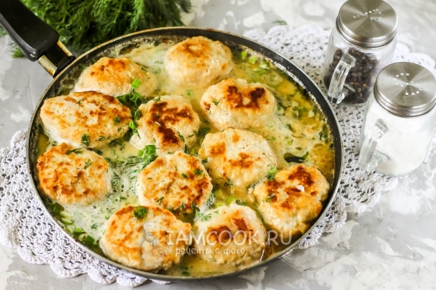 После этого переверните котлеты на другую сторону и накройте емкость крышкой. Обжаривайте такое же количество времени до получения румяной корочки. После чего снимите крышку и выложите в емкость сметану любой жирности.