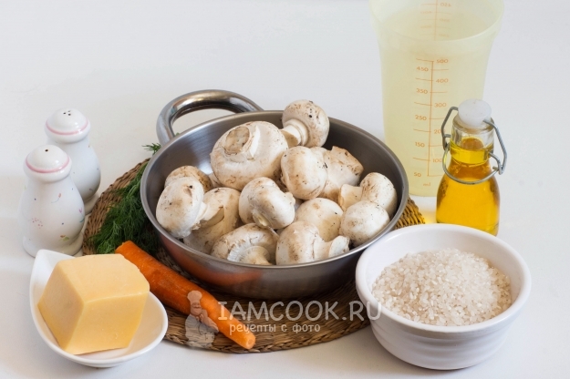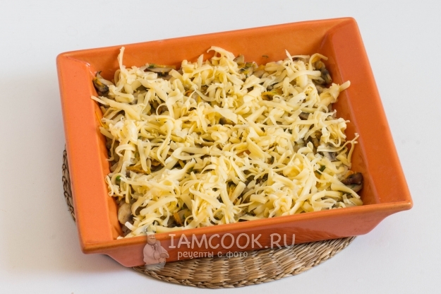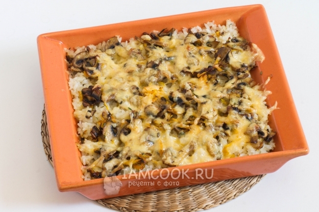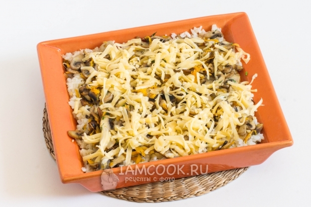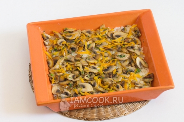 Сверху на рис выложите половину грибной массы, также разровняйте.