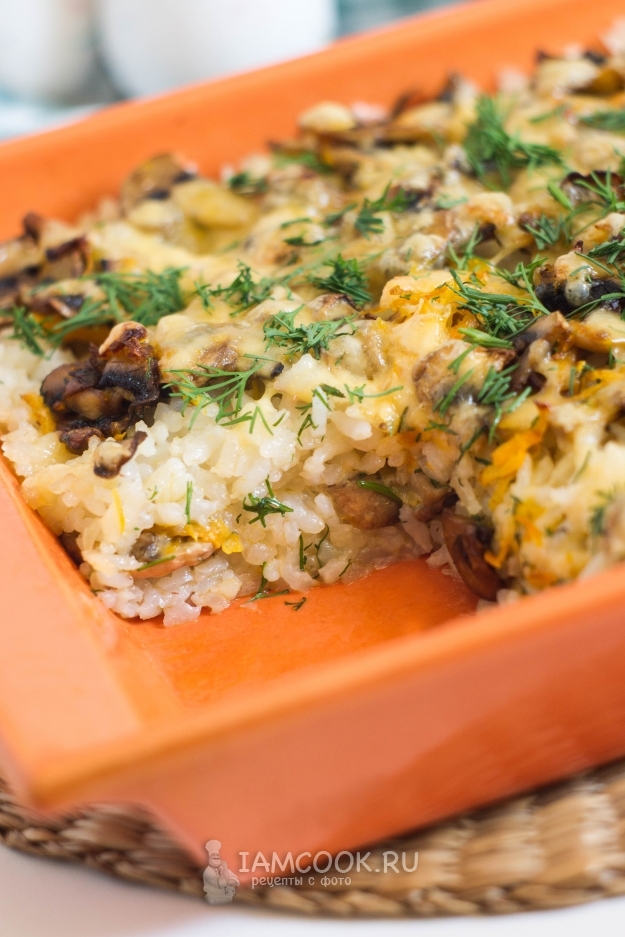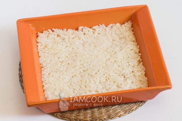 Форму для запекания смажьте сливочным маслом, выложите половину риса. Разровняйте.