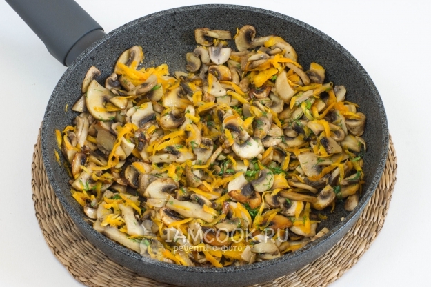 Добавьте к грибам натертую на крупной терке морковь и измельченную свежую зелень. Посолите, поперчите и перемешайте.