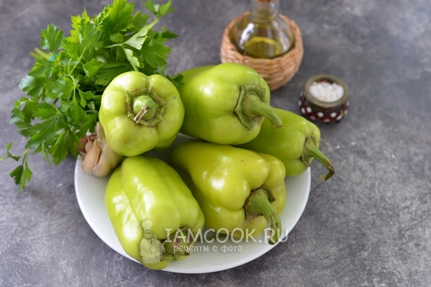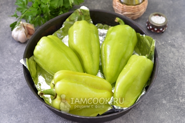 Перец тщательно помойте под проточной водой, выложите в противень, отправьте в разогретую до 200 градусов духовку на 25-30 минут.