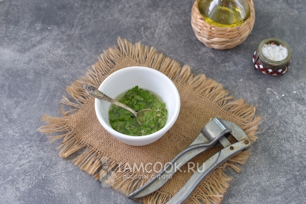 В пиалочку налейте постного масла, выдавите чеснок, добавьте нарубленную свежую зелень, перемешайте. В некоторых семьях в чесночное масло добавляли немного уксуса, но мне нравится именно натуральный вкус готового блюда.