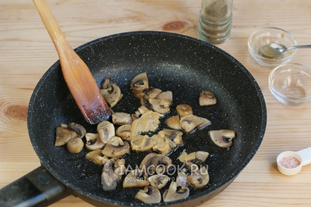 На растительном масле обжарим шампиньоны, через 2 минуты добавим к ним горчицу, винный уксус, соль и перец, перемешаем и секунд через 15 выложим из сковороды в другую емкость.