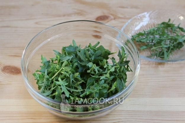 Помытую и обсушенную рукколу порвем произвольно руками и выложим в салатник.