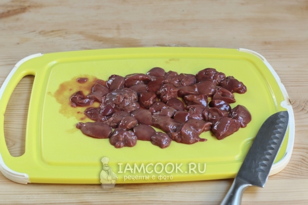 Печенку порежем небольшими кусочками размером на один укус.