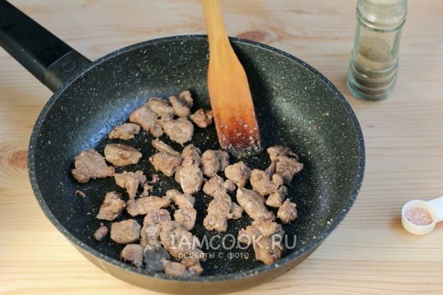 А в сковороду кладем печень и обжариваем ее до готовности на небольшом огне около 3-х минут, постоянно помешивая, чтобы она обжаривалась со всех сторон равномерно. Не забудем приправить ее перцем и солью по вкусу. Затем снимем сковороду с огня, оставив в ней печень, чтобы она не остыла.