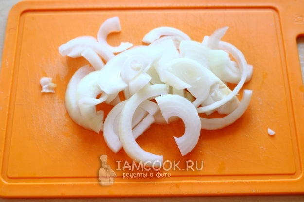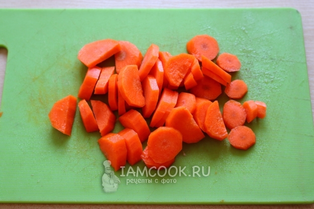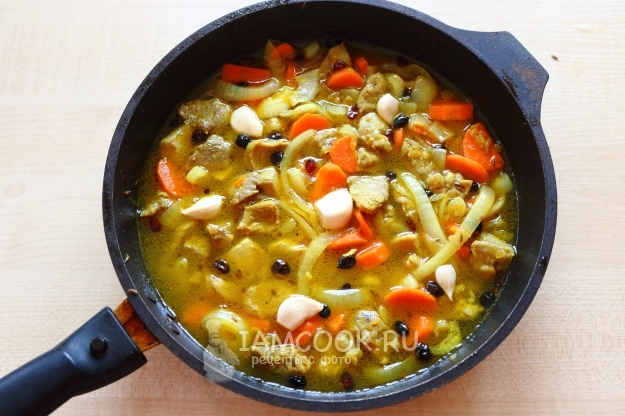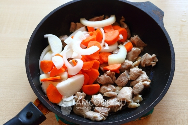 Индейку тушим в собственном соку до выпаривания жидкости. После чего вливаем растительное масло, выкладываем лук и морковь. Жарим всё вместе 5 минут.