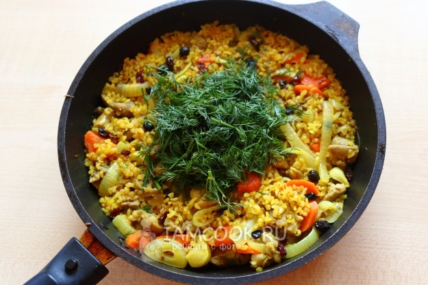 Плов из булгура с индейкой готов! Подаём к столу, украсив свежей зеленью. Приятного аппетита!