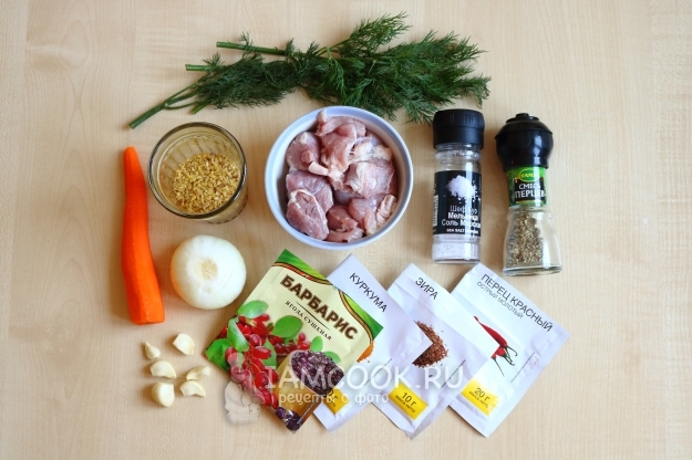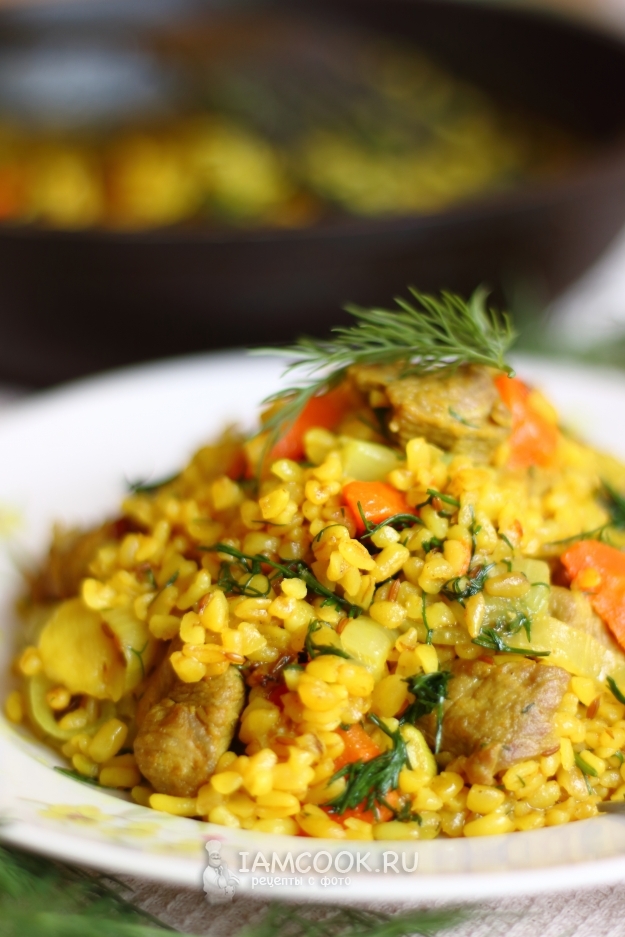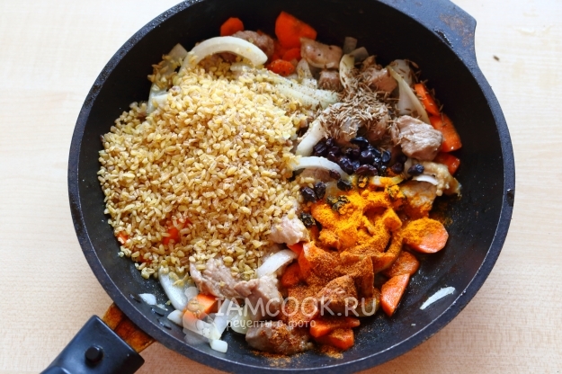 Затем высыпаем на сковороду булгур и специи: соль, красный и черный перцы, зиру, барбарис, куркуму. Я пряности люблю, а потому кладу их чуть больше, чем указано. И вы ориентируйтесь на свои предпочтения. Перемешиваем и обжариваем всё вместе ещё пару минут.
