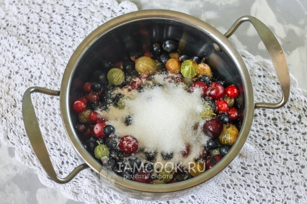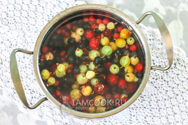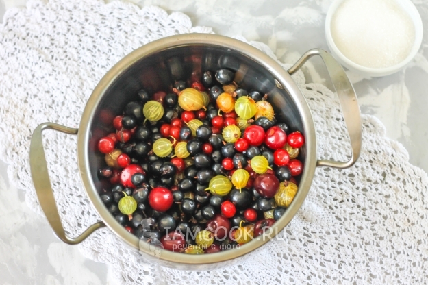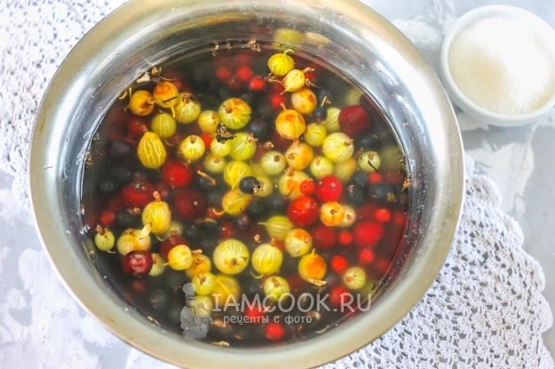 Ягоды оборвите с веточек, всыпьте в миску и залейте холодной водой. Промойте. Со смородины и крыжовника срежьте хвостики, по желанию - из вишен извлеките косточки.